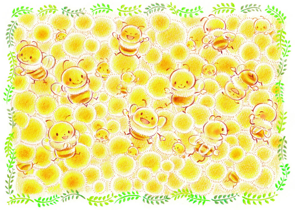 女王バチ(お母さん)から生まれた働きバチが、一生懸命はちみつをとっている姿は、女王バチから見て、とてもいとおしい存在なんだろうなぁ~と想像しながら、描きました。